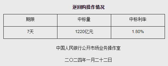 中新網(wǎng)1月22日電 據(jù)央行網(wǎng)站消息,為維護(hù)銀行體系流動(dòng)性合理充裕,2024年1月22日人民銀行以利率招標(biāo)方式開(kāi)展了1220億元逆回購(gòu)操作,中標(biāo)利率1.80%,期限為7天。具體情況如下: