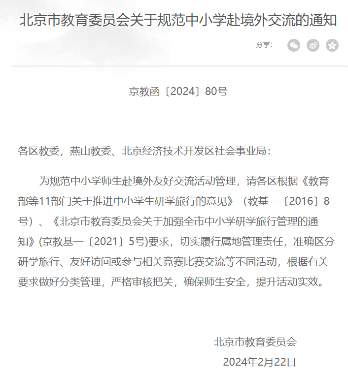 央廣網(wǎng)北京3月11日消息(記者馮儀)近日,北京市教委發(fā)布關(guān)于規(guī)范中小學(xué)赴境外交流的通知,通知中提到,請(qǐng)各區(qū)根據(jù)《教育部等11部門關(guān)于推進(jìn)中小學(xué)生研學(xué)旅行的意見(jiàn)》(教基一〔2016〕8號(hào))、《北京市教育委員會(huì)關(guān)于加強(qiáng)全市中小學(xué)研學(xué)旅行管理的通知》(京教基一〔2021〕5號(hào))要求,切實(shí)履行屬地管理責(zé)任,準(zhǔn)確區(qū)分研學(xué)旅行、友好訪問(wèn)或參與相關(guān)競(jìng)賽比賽交流等不同活動(dòng),根據(jù)有關(guān)要求做好分類管理,嚴(yán)格審核把關(guān),確保師生安全,提升活動(dòng)實(shí)效。