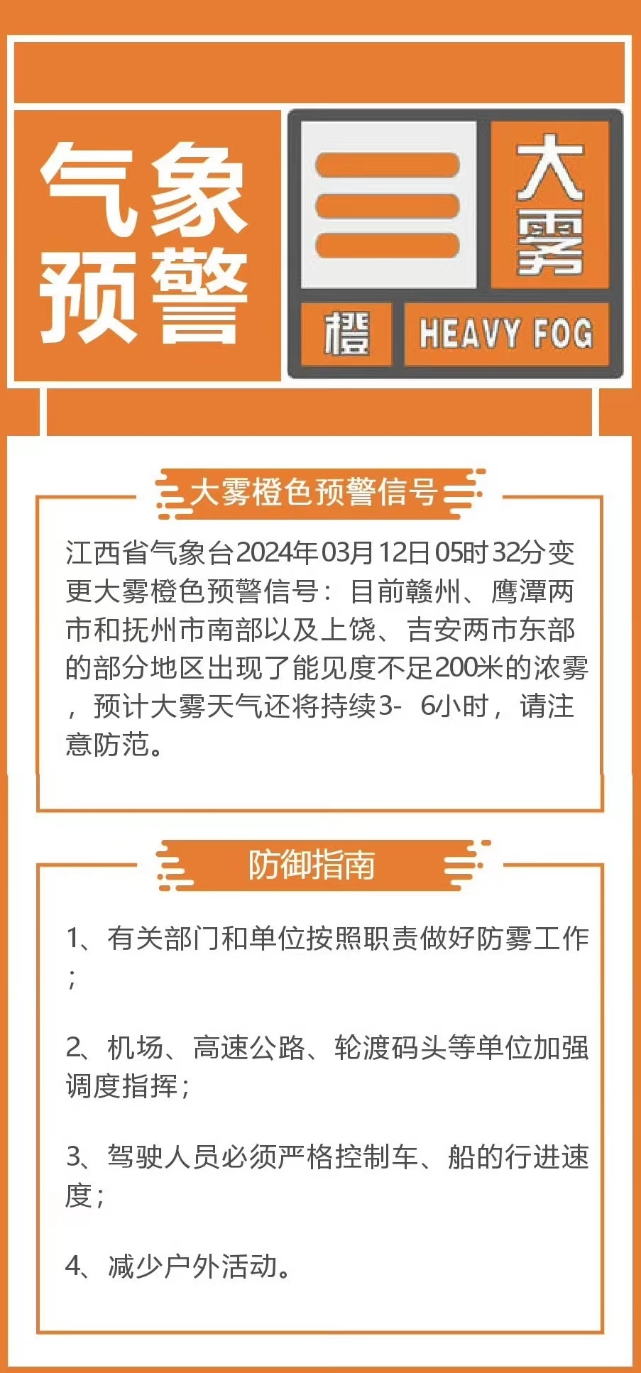 江西省氣象臺(tái)2024年3月12日5時(shí)32分變更大霧橙色預(yù)警信號(hào):目前贛州、鷹潭兩市和撫州市南部以及上饒、吉安兩市東部的部分地區(qū)出現(xiàn)了能見度不足200米的濃霧,預(yù)計(jì)大霧天氣還將持續(xù)3~6小時(shí),請(qǐng)注意防范。