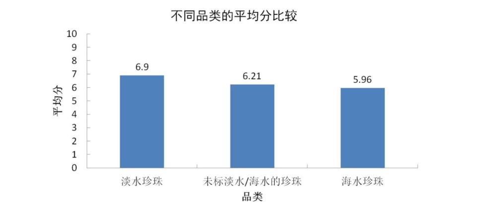③珍珠飾品品類比較:對(duì)購(gòu)買樣品按產(chǎn)品分類進(jìn)行橫向打分比較,平均得分由高至低分別為:淡水珍珠6.9分、珍珠(未標(biāo)識(shí)淡水或海水)6.21分、海水珍珠5.96分。
