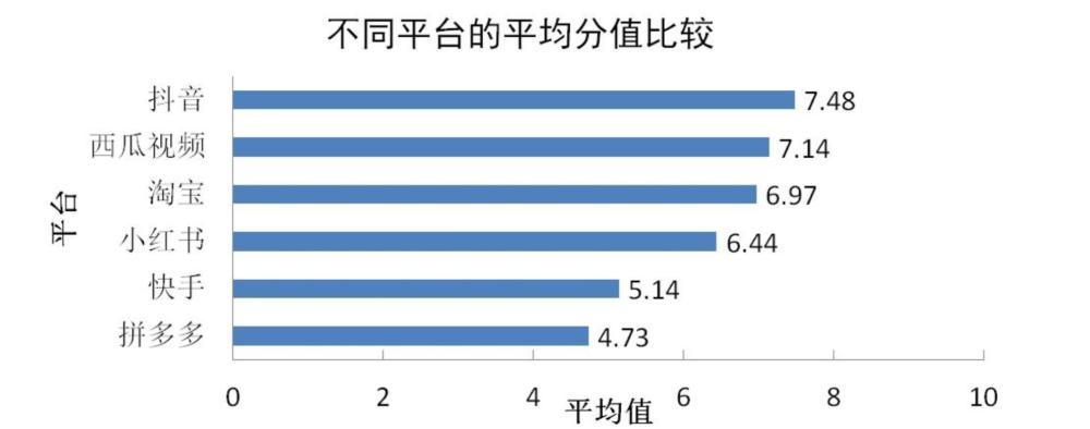 ①平臺(tái)比較:本次調(diào)查對(duì)買樣數(shù)超過五件的平臺(tái)進(jìn)行橫向打分比較,平均得分由高至低分別為:抖音7.48分、西瓜視頻7.14分、淘寶6.97分、小紅書6.44分、快手5.14分、拼多多4.73分。
