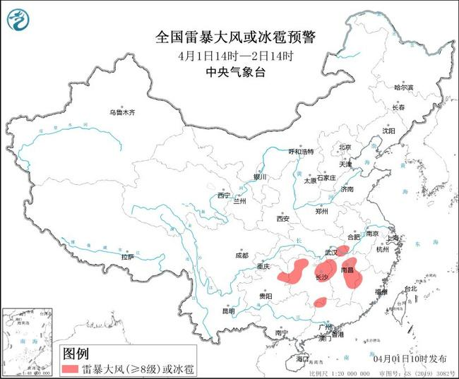 預計4月1日14時至2日14時,湖北東部、湖南中北部、江西中北部、貴州東北部等地的部分地區(qū)將有8—10級雷暴大風或冰雹天氣,局地風力可達11級以上;安徽中南部、江蘇中南部、湖北中東部、湖南中北部、江西、浙江西部、福建西部和沿海地區(qū)、重慶中部、貴州東部、云南西北部、廣東北部等地的部分地區(qū)將有短時強降水天氣,最大小時雨量30—50毫米,局地可達70毫米以上。