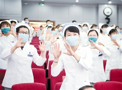 5月11日,北京大學(xué)第三醫(yī)院舉辦紀(jì)念南丁格爾誕辰200周年暨歡迎援鄂護(hù)士返崗活動(dòng)?;顒?dòng)中,對優(yōu)質(zhì)護(hù)理服務(wù)先進(jìn)集體、十佳護(hù)士等進(jìn)行了表彰。全體醫(yī)護(hù)人員重溫南丁格爾誓言,并用手語舞蹈《聽我說謝謝你》,表達(dá)對醫(yī)護(hù)人員崇高的敬意。本報(bào)記者張丹 特約記者仰東萍攝影報(bào)道