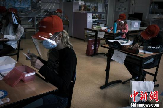 當(dāng)?shù)貢r(shí)間5月12日,法國(guó)中部圣埃蒂安附近的拉格蘭德克羅伊市,當(dāng)?shù)匦W(xué)生戴著統(tǒng)一發(fā)放的面罩上課。據(jù)報(bào)道,當(dāng)?shù)貢r(shí)間5月11日,法國(guó)開(kāi)始逐步“解封”,結(jié)束已經(jīng)持續(xù)55天的全國(guó)“封城”狀態(tài)。