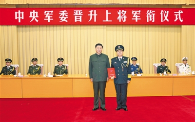 下午4時(shí)30分許,晉銜儀式在莊嚴(yán)的國歌聲中開始。中央軍委副主席許其亮宣讀了中央軍委主席習(xí)近平簽署的晉升上將軍銜命令。中央軍委副主席張又俠主持晉銜儀式。