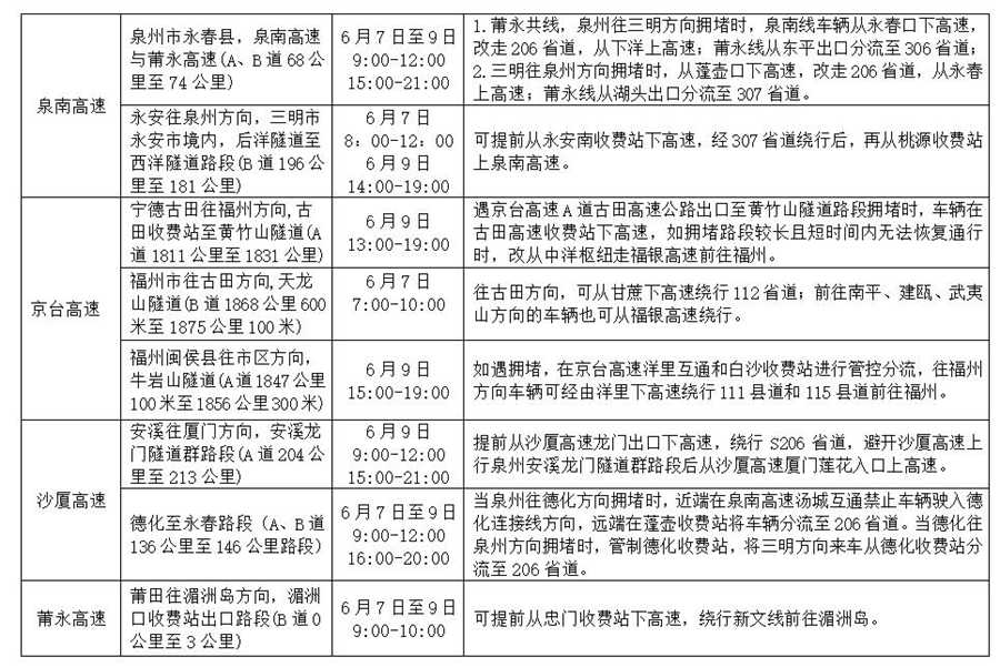 人民網(wǎng)福州6月5日電(余杉芳)來自福建省公安廳交警總隊的消息,2019年端午節(jié)假期為6月7日至9日,恰逢全國高考期間,相比清明、五一等節(jié)假日,高速公路網(wǎng)運行壓力較小,但車流量較平時會有明顯增加,部分路段車流量“潮汐”現(xiàn)象明顯。交警總隊發(fā)布了端午節(jié)假期福建各地高速行車安全提示,同時公布高速公路危險和事故多發(fā)點段有18個、易擁堵路段有13個,管制路段有1個。