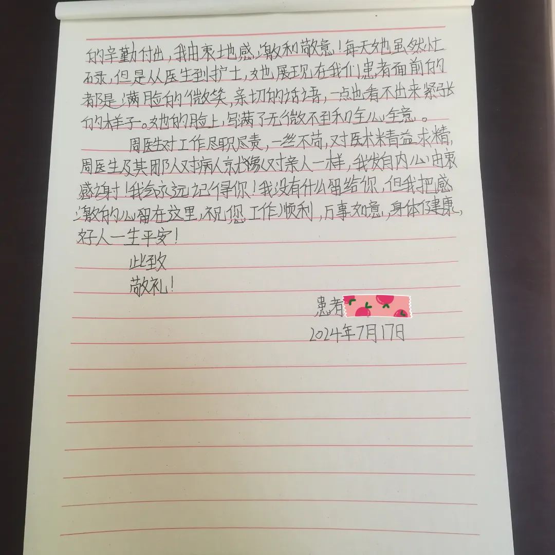 7月1日,一名在德格縣人民醫(yī)院就診的結(jié)核患者向成都市公共衛(wèi)生臨床醫(yī)療中心援藏醫(yī)師周瑜送來了一封感謝信,在信中,患者對周瑜醫(yī)生及其團隊在住院期間給予她的積極診治和熱情關(guān)懷表示感謝,并對科室團隊的診療技術(shù)和治療的預(yù)后效果都作出了非常高的評價。