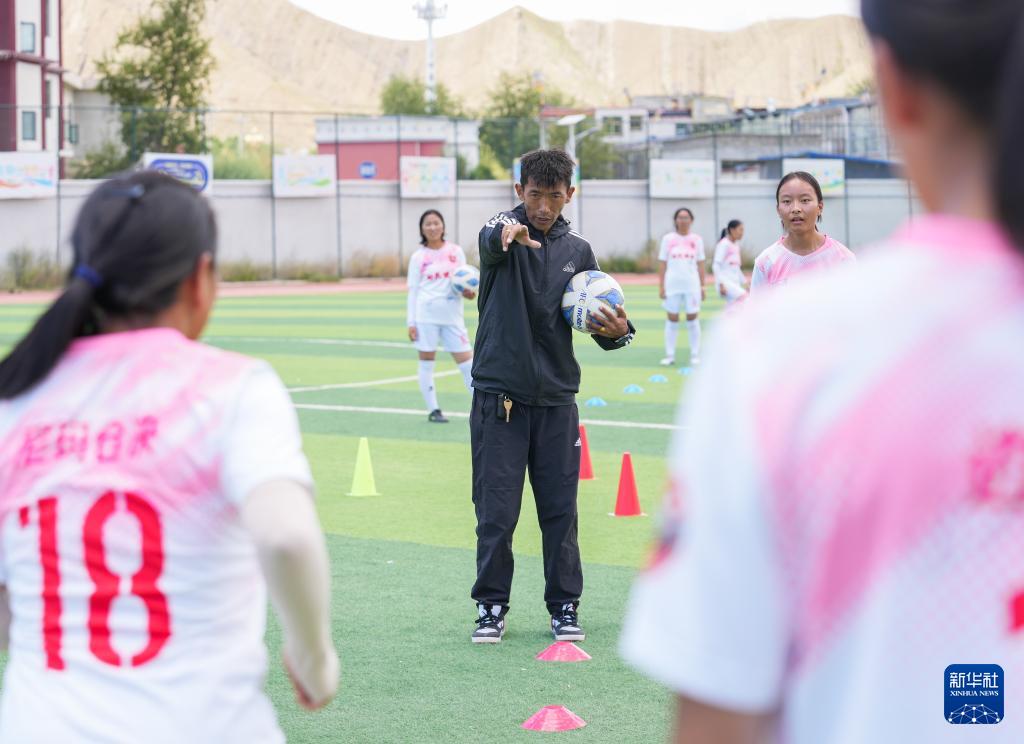 西藏日喀則市上海實驗學(xué)校“珠峰雪鷹”女子足球隊教練王劍平(前)在操場上指導(dǎo)球員訓(xùn)練(9月3日攝)。