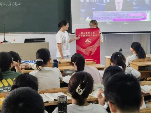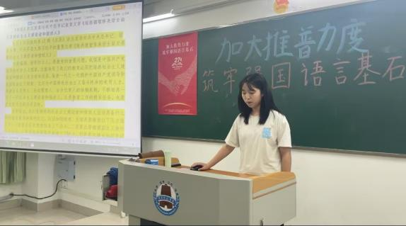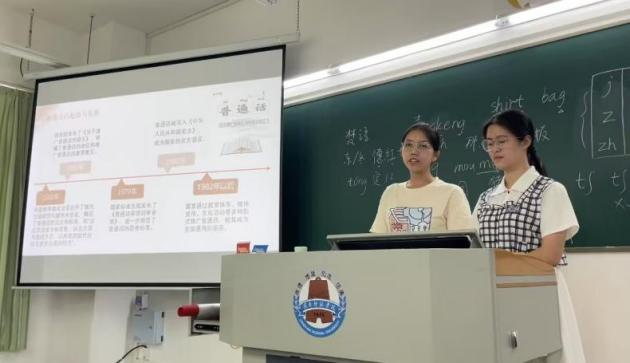 新學(xué)期伊始,《教師語言》課程教學(xué)團(tuán)隊將推普宣傳與課程的“音韻筑基”內(nèi)容相結(jié)合,理論層面講解我國通用語言文字的相關(guān)法律政策和普通話聲、韻、調(diào)等基礎(chǔ)知識;實踐層面指導(dǎo)學(xué)生利用中國語言文字?jǐn)?shù)字博物館、師圈小程序等課程資源進(jìn)行學(xué)習(xí),邀請學(xué)生介紹普通話的發(fā)展歷程和我國第27屆推普宣傳主題中所滲透的“強(qiáng)國必須強(qiáng)語,強(qiáng)語助力強(qiáng)國”價值內(nèi)涵。
