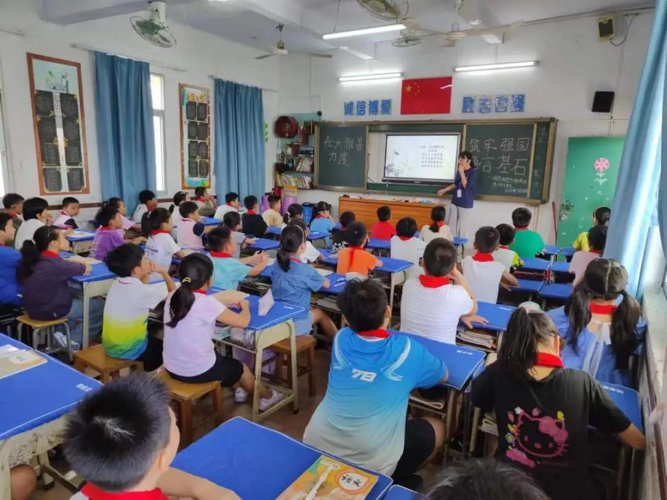 21級實習(xí)生戴鈺瑩在湛江市第四小學(xué)舉辦推普活動,將紅色經(jīng)典與傳統(tǒng)文化教育相結(jié)合,通過誦讀《西江月·井岡山》和《三字經(jīng)》,讓學(xué)生感受到革命先烈的英勇無畏,傳承了中華民族的傳統(tǒng)美德與智慧,增強(qiáng)了文化自信與民族自豪感。