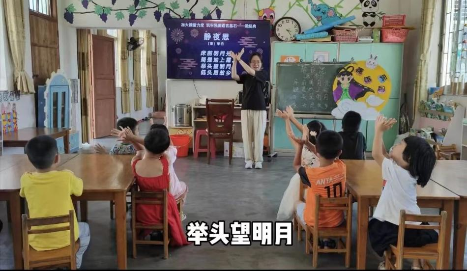 20級畢業(yè)生陳永麗指導(dǎo)云浮市郁南縣寶珠鎮(zhèn)中心幼兒園學(xué)生借助手勢舞誦讀《靜夜思》。學(xué)前教育階段是幼兒語言發(fā)展的關(guān)鍵時期,此時的語言環(huán)境和教育對幼兒的語言能力發(fā)展具有重要影響。推廣普通話,能夠讓幼兒在規(guī)范的語言環(huán)境中成長,有利于其語言能力的全面發(fā)展和提高。手勢舞與古詩詞結(jié)合,能激發(fā)幼兒學(xué)習(xí)興趣,啟蒙傳統(tǒng)文化,提升教學(xué)效果和鄉(xiāng)村幼兒園教育質(zhì)量。