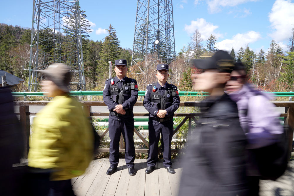 吉林長(zhǎng)白山邊境管理支隊(duì)民警在景區(qū)游客密集處執(zhí)勤。