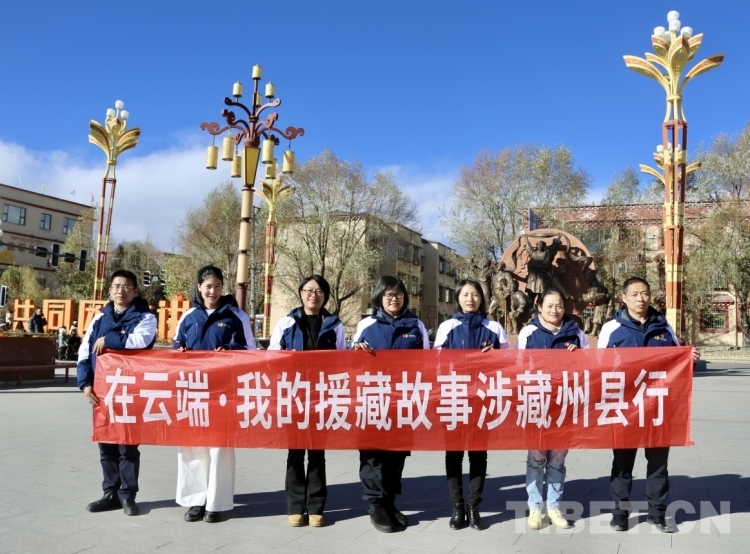 圖為宣講團(tuán)援藏干部代表在甘孜縣羅布林廣場(chǎng)合影留念 攝影:龍真多吉