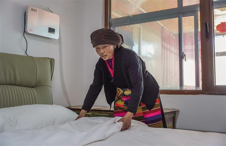 倫珠曲珍今年40歲,是這家的二女兒,15年前嫁到外村,每年都會(huì)回來(lái)看望父母。由于同行的人員出現(xiàn)高反癥狀,倫珠曲珍便主動(dòng)邀請(qǐng)記者到他們家的“高原暖心房”里休息調(diào)整?!案咴姆俊痹O(shè)置在她家客廳的里側(cè),屋內(nèi)寬敞明亮、干凈整潔。墻壁上的恒溫裝置讓屋子始終保持在宜人的20攝氏度左右?!拔覀兇蛟斓摹咴姆俊銣匦Ч貏e好,最高溫度能達(dá)到30多攝氏度。而且因?yàn)槭褂玫牟馁|(zhì)特殊,就算不開(kāi)恒溫裝置,幾個(gè)人待在屋里也不會(huì)覺(jué)得冷??纯催@些家具,都是村里愛(ài)心小屋提供的。”廖旭東介紹道。