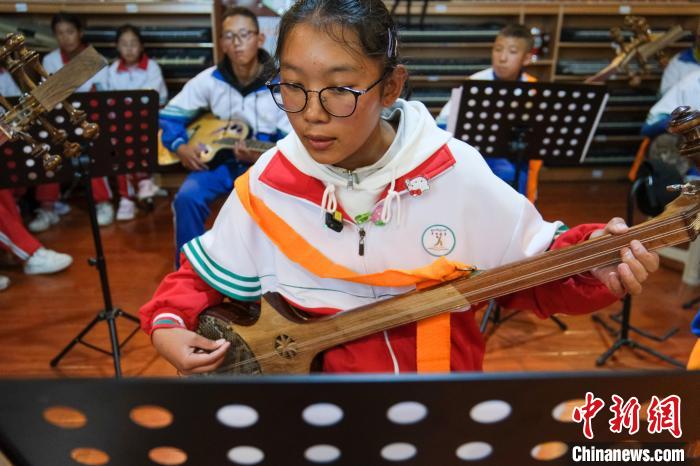 2024年9月9日,西藏山南浪卡子縣中學(xué)初二年級(jí)學(xué)生白瑪卓嘎學(xué)習(xí)彈六弦琴。 中新社記者 江飛波 攝