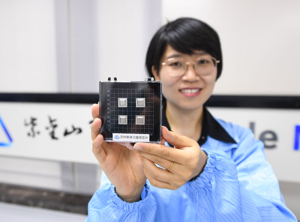 在南京紫金山實(shí)驗(yàn)室6G綜合實(shí)驗(yàn)室,科研人員展示自主研發(fā)的貝葉斯學(xué)習(xí)基帶芯片(2023年7月6日攝)。新華社記者 季春鵬 攝