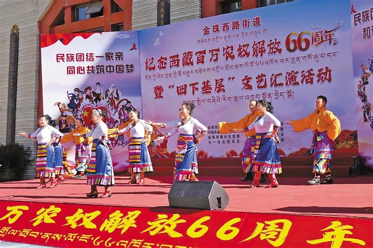 圖為拉薩市城關區(qū)金珠西路街道舉辦紀念西藏百萬農奴解放66周年暨“四下基層”文藝匯演活動現(xiàn)場。通訊員 扈顯嶺 攝
