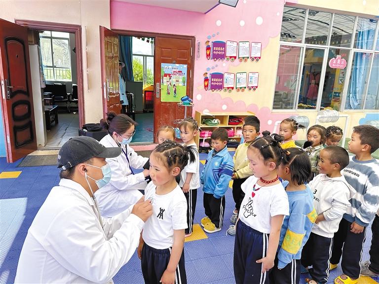 江蘇援藏醫(yī)療隊為墨竹工卡縣幼兒園的小朋友檢查身體。