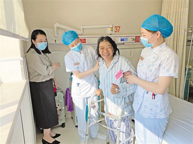圖為患者布珠術(shù)后在醫(yī)護(hù)人員的幫助下進(jìn)行康復(fù)訓(xùn)練。 記者 周婷婷 攝