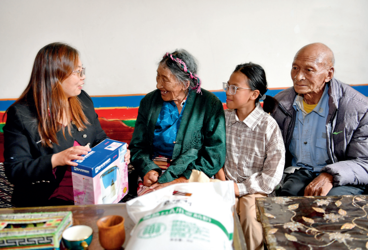 王玉秀(左一)來到拉薩市達孜區(qū)德慶鎮(zhèn)次旦老人家走訪并送上慰問品(2022 年 7 月 27 日攝) 張汝鋒攝