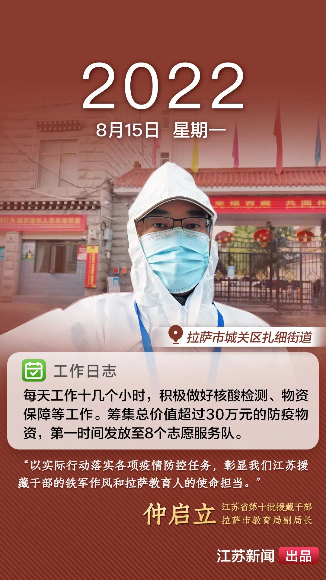 2022年8月,一場突如其來的新冠肺炎疫情襲擊拉薩。江蘇援藏前方指揮部樹立高度的政治意識,堅決貫徹江蘇省委、省政府主要領(lǐng)導(dǎo)批示精神和自治區(qū)、拉薩市部署要求,全力以赴做好疫情防控工作。第十批援藏干部人才克服初到高原的身體反應(yīng),服從服務(wù)大局、勇于擔(dān)當(dāng)作為,迅速投身疫情防控工作一線,以實際行動展現(xiàn)江蘇援藏的鐵軍作風(fēng)。近期,我們將陸續(xù)推出江蘇援藏干部人才抗疫身影,敬請關(guān)注。