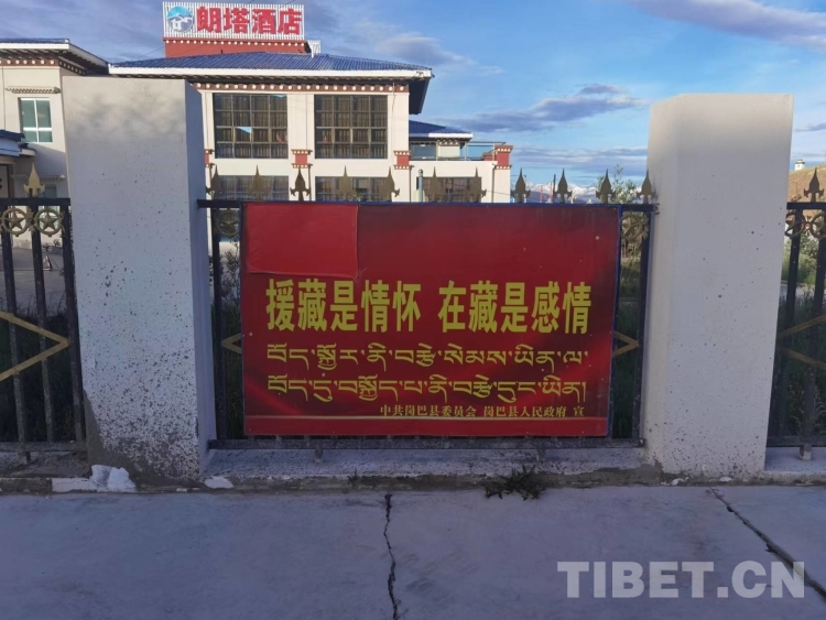 圖為崗巴縣城“援藏是情懷,在藏是感情”標(biāo)語 (2022年7月拍攝)