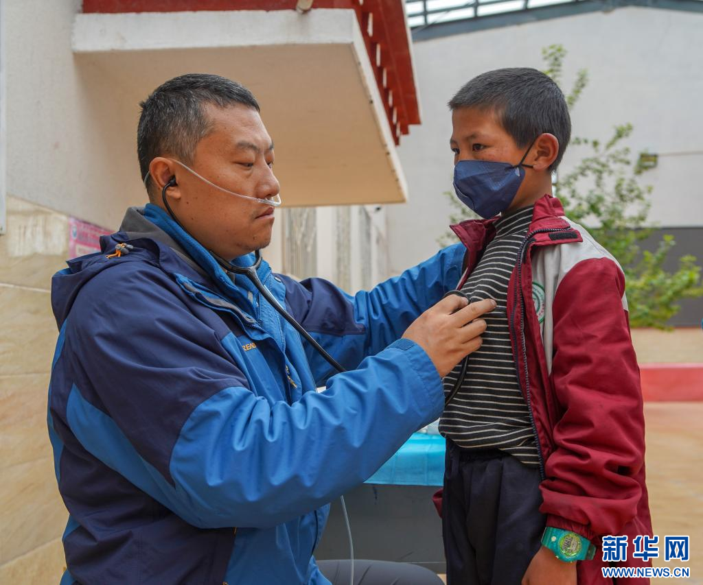7月4日,耿直醫(yī)生在給那曲市色尼區(qū)尼瑪鄉(xiāng)小學學生做心臟聽診。(新華社記者 邵澤東 攝)