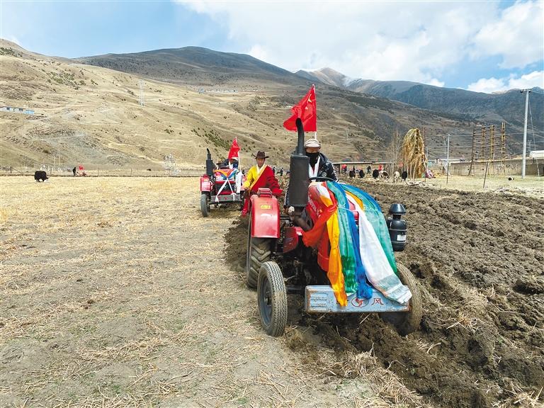 儀式現(xiàn)場,農(nóng)牧民群眾身著節(jié)日盛裝,帶著哈達、酥油茶等聚齊在田間舉行開犁儀式,祈禱全年風調(diào)雨順、五谷豐登。懸掛著五星紅旗和黨旗的大型農(nóng)機具和拖拉機一字排開,在“轟隆隆”的響聲中,年輕的機手們開動拖拉機翻耕土地,婦女們熟練地躬身平土,土地逐漸變得平整松軟,一幅生機勃勃的“春耕畫卷”在加勤鄉(xiāng)的土地上徐徐展開。