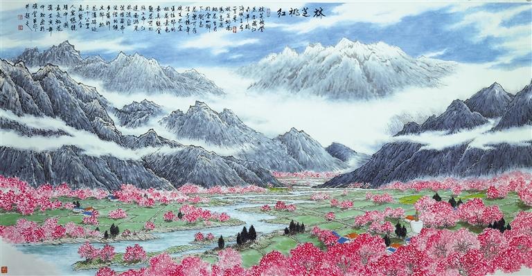 我擺手提示她,悄聲說,不要在這里冒充內(nèi)行,那邊有人。此時那位先生或許聽到了這句話,微笑著挪步過來。他說,林芝這個地方,他去過多次。他要把人們向往的林芝、游客看到的林芝、當(dāng)?shù)厝耸熘牧种?,用中國畫的形式表現(xiàn)出來。這幅畫是以現(xiàn)實主義表達方式創(chuàng)作的,屬中國畫中的寫意山水。這幅畫的素材來自林芝展現(xiàn)給我們的實景元素。繪畫藝術(shù)是在發(fā)現(xiàn)美的基礎(chǔ)上創(chuàng)造美。這位女士說得好。你們看,大家熟悉的林芝自然元素,在這幅畫里都能找到,而且桃花是主角,有田野做底色、蒼松積雪相映襯,還有猶如白色哈達的那些云,林芝桃紅讓人印象深刻。我笑言,老哥的這番話,就像這幅畫是你畫的一樣。他說,正因為我們?nèi)ミ^這些地方,觀的是景,繪的是畫,表的是心,所以如同再次身臨其境,沉浸在大自然中。