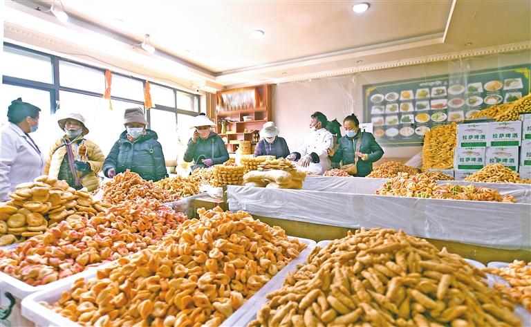 隨著藏歷新年日益臨近,拉薩街頭巷尾各種琳瑯滿目的“藏式”年貨,讓年味兒越來(lái)越濃,而構(gòu)成這年味兒最重要的元素之一就是“卡賽”的香味兒?!翱ㄙ悺笔且环N油炸面食,是藏歷新年必不可少的食物。藏歷新年前夕,古城拉薩各個(gè)加工銷售“卡賽”的店鋪飄出陣陣香味。