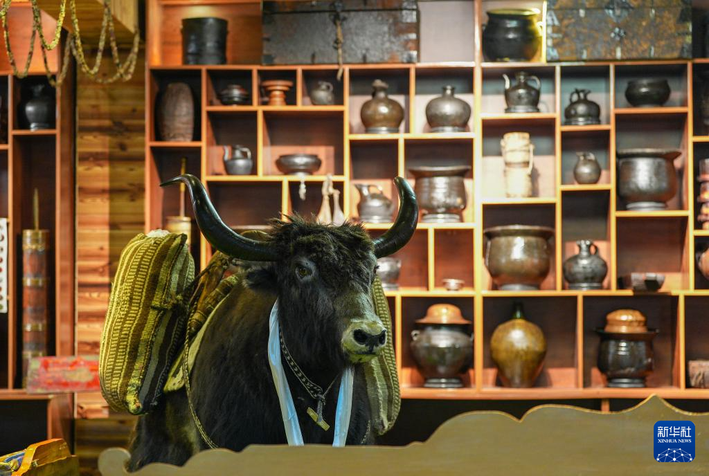 茶館主人珠珠將藏式茶館與民俗陳列方式相結合,讓顧客在品嘗美食的同時,沉浸式體驗民俗文化。茶館四周和過道上擺滿700余種3000多件西藏民俗物件,有給牛犢喂奶的牛角奶瓶、火柴盒大小的便攜酥油盒、防沙塵和雪盲的牦牛毛墨鏡等。牧民生產生活用具幾乎都能在這里找到,獨具風格的茶館儼然成為一座藏北游牧文化“博物館”。