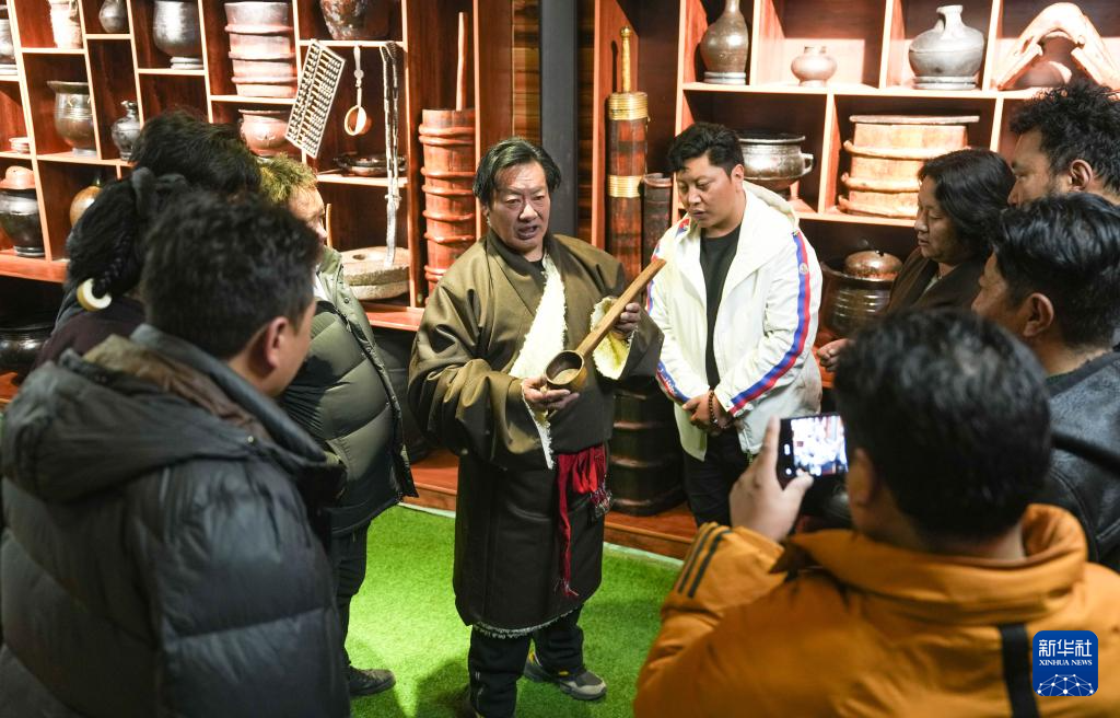 當地民俗專家貢布洛旺(中左)在“牧人寶庫”藏式茶館給顧客講解館藏物件(2月13日攝)。新華社記者 晉美多吉 攝