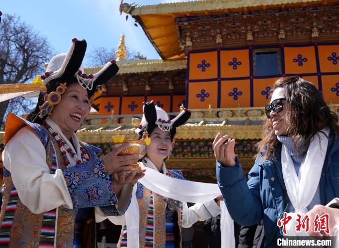 2月20日,2025年香港至拉薩航班首航旅行團(tuán)歡迎儀式現(xiàn)場(chǎng),工作人員向香港游客敬獻(xiàn)青稞酒。李林 攝