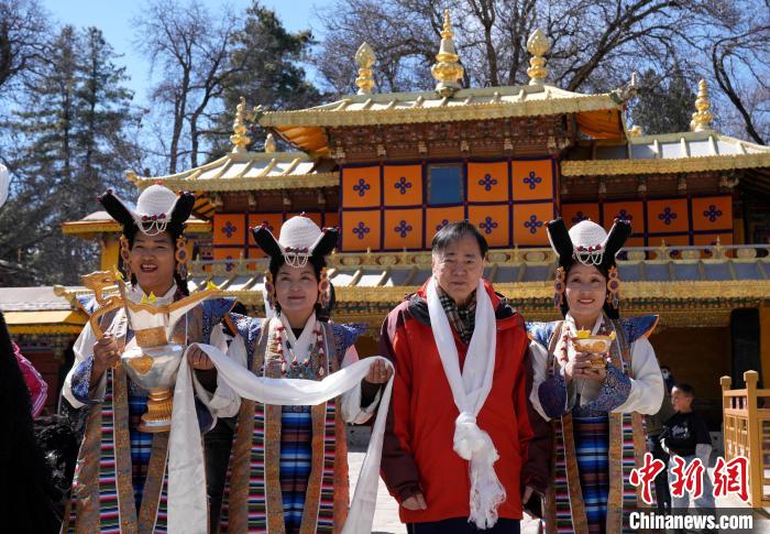 2月20日,2025年香港至拉薩航班首航旅行團(tuán)歡迎儀式現(xiàn)場(chǎng),香港游客梁籌庭(右二)在羅布林卡與身著拉薩傳統(tǒng)服飾的工作人員合影留念。李林 攝