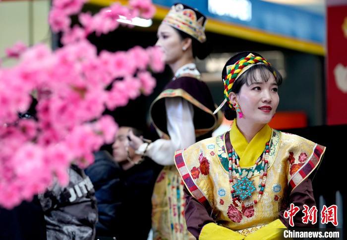 圖為西藏林芝第二十二屆桃花旅游文化節(jié)推介會(拉薩站)現(xiàn)場,身著藏裝的工作人員。李林 攝