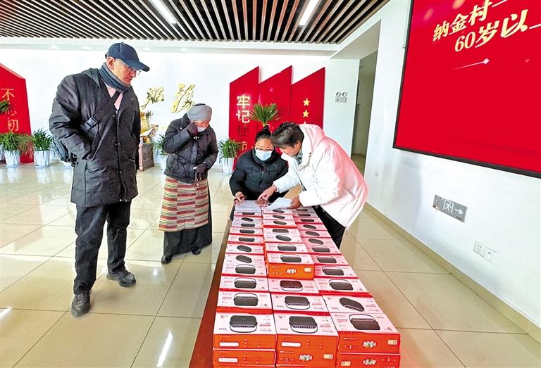 圖為納金村委會(huì)工作人員為轄區(qū)老人免費(fèi)發(fā)放收音機(jī)。記者 格桑倫珠 攝