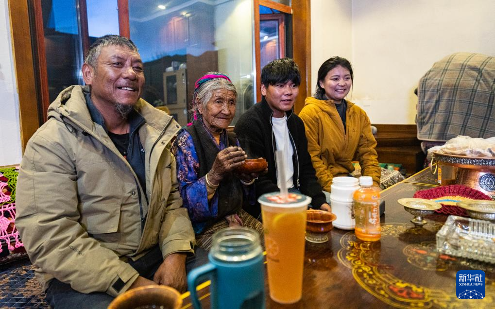 格桑美多老人(前)和家人的合影(3月12日攝)。新華社記者 晉美多吉 攝