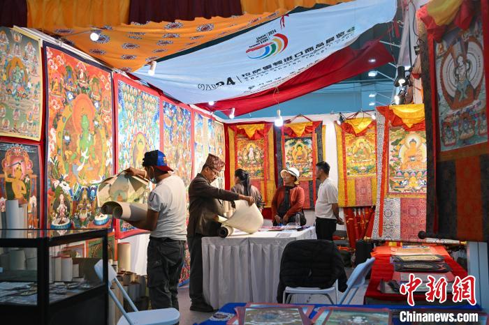 圖為拉薩進(jìn)口商品展覽會現(xiàn)場,顧客在選購唐卡。中新社記者 貢嘎來松 攝