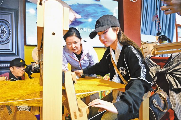 日本游客在體驗(yàn)氆氌編織技藝。