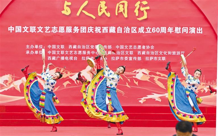 5月23日,在中國(guó)文藝志愿者服務(wù)日到來(lái)之際,由中國(guó)文聯(lián)、西藏自治區(qū)黨委宣傳部、中國(guó)文藝志愿者協(xié)會(huì)共同主辦的“與人民同行”慰問(wèn)演出在西藏會(huì)展中心廣場(chǎng)隆重舉行。這場(chǎng)慶祝西藏自治區(qū)成立60周年的文藝盛宴,在歌舞《鼓舞西藏》激昂的節(jié)奏中拉開(kāi)帷幕。