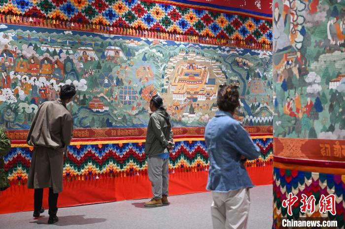 圖為民眾參觀唐卡《吐蕃贊普世系大唐卡金子明鏡》。貢嘎來松 攝