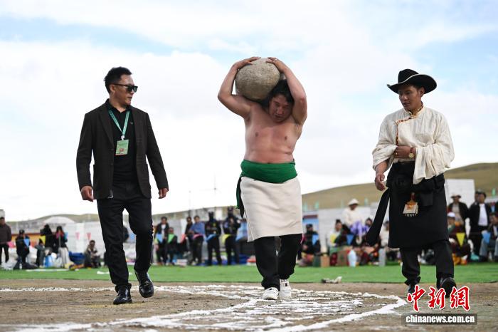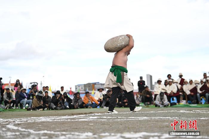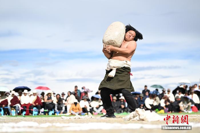 9月5日,2025年那曲市恰青賽馬節(jié)在格薩爾賽馬場(chǎng)開幕。當(dāng)日,賽場(chǎng)中不僅有駿馬飛馳,更有力量的精彩較量。在抱石頭比賽現(xiàn)場(chǎng),來(lái)自那曲市各縣(區(qū))的男女選手們鼓足干勁,挑戰(zhàn)自我。這項(xiàng)傳統(tǒng)體育項(xiàng)目,展現(xiàn)了藏北人民的堅(jiān)韌與力量。圖為男參賽選手在抱石頭比賽。中新社記者 貢嘎來(lái)松 攝