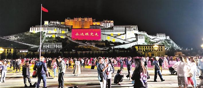 投影在布達拉宮上的“永遠跟黨走”宣傳標語。記者 劉慶順 攝