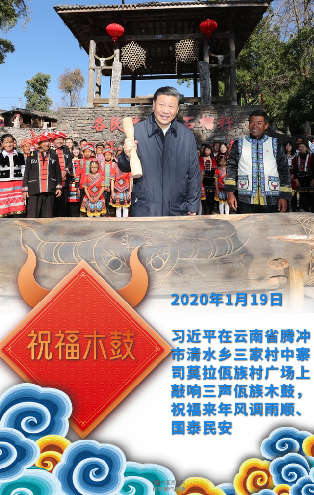 習(xí)近平在云南省騰沖市清水鄉(xiāng)三家村中寨司莫拉佤族村廣場上敲響三聲佤族木鼓,祝福來年風(fēng)調(diào)雨順、國泰民安