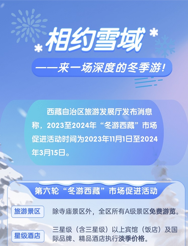 西藏自治區(qū)旅游發(fā)展廳發(fā)布消息稱,2023至2024年“冬游西藏”市場(chǎng)促進(jìn)活動(dòng)時(shí)間為2023年11月1日至2024年3月15日。[詳細(xì)]