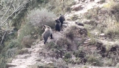 黑豹野生動(dòng)物保護(hù)站站長(zhǎng)李理介紹:“我們傍晚5點(diǎn)左右架設(shè)好設(shè)備, 6點(diǎn)30分左右就拍到藏棕熊了,當(dāng)時(shí)非常興奮”。他說(shuō):“當(dāng)時(shí)天馬上就黑了,山里忽然下起了冰渣子,藏棕熊就在樹(shù)林間若隱若現(xiàn),后來(lái)它跑到一個(gè)光禿禿的山下,它狀態(tài)很好,非常健壯?!焙芸欤蠹矣职l(fā)現(xiàn)了第二只。隊(duì)員們的衣服都被冰渣子打濕了,高山上非常冷,但還是給相機(jī)做好防水,拍下了這寶貴的畫(huà)面。第二天傍晚,還是在同一地點(diǎn),前一天晚上觀測(cè)到的一只藏棕熊再次出現(xiàn),不過(guò)這次,它帶了兩只小熊。大公熊強(qiáng)壯而霸道,帶幼崽的母熊小心謹(jǐn)慎,小熊憨態(tài)可掬,都非??蓯?ài)。