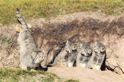 早上8時(shí)左右,暖洋洋的太陽(yáng)灑在山坡上,這時(shí)五六十米外的洞穴中有了動(dòng)靜,只見一種有著黃色眼睛和寬短耳朵,形似家貓的動(dòng)物探頭探腦地出來了,原來是一只兔猻媽媽帶著三只小兔猻出來覓食。