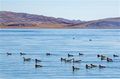 羊卓雍錯自2014年被納入國家良好湖泊生態(tài)環(huán)境保護(hù)試點(diǎn)工程項目以來,羊卓雍錯周邊生態(tài)環(huán)境持續(xù)向好,棲息繁衍的野生動物數(shù)量逐年增多。這是近日拍攝的羊卓雍錯湖面上的水鳥。新華社記者 孫非 攝