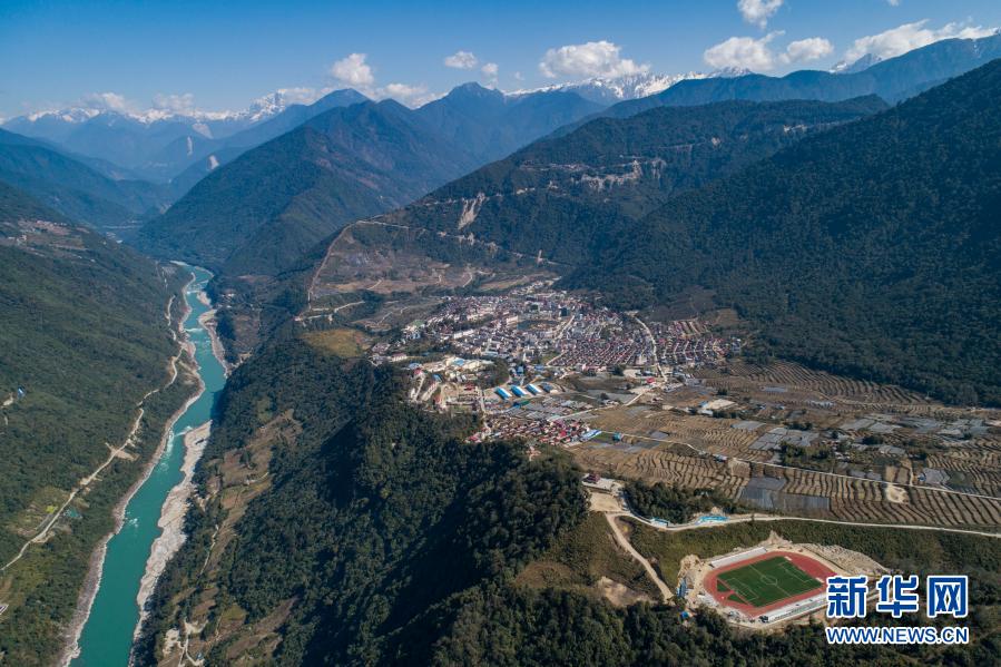 這是墨脫縣城,左側河流為雅魯藏布江(2月13日攝,無人機照片)。新華社記者 孫非 攝