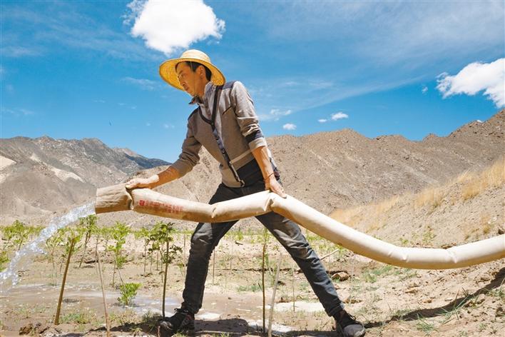 山南市貢嘎縣吉雄鎮(zhèn)劉瓊村村民正在為樹苗澆水(6月2日攝)。新華社記者 普布扎西 攝